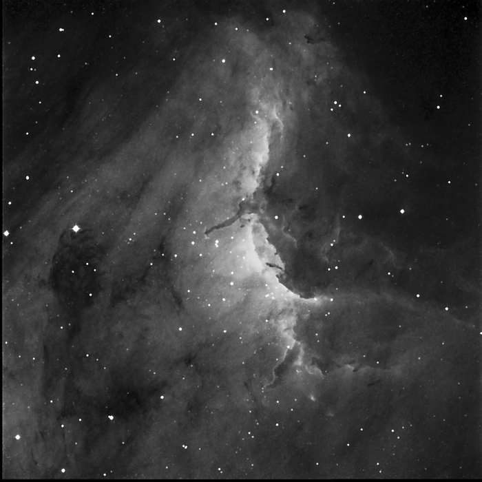 HH555 and its polar jets just show up at the end of the dust pillar in the centre The bright ridge is IC5067. Move mouse over image for zoom.