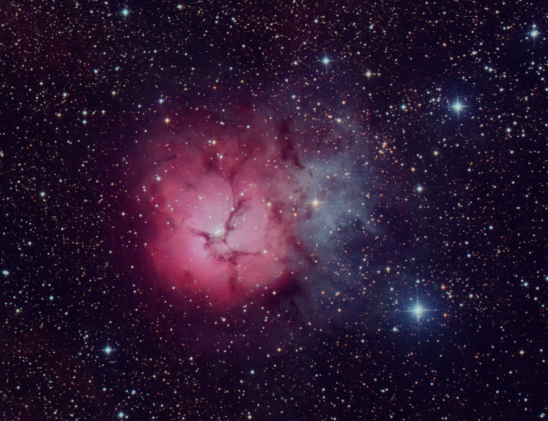 The Trifid, emission (red), refection (blue) and dark (B85) nebula complex in Sagittarius