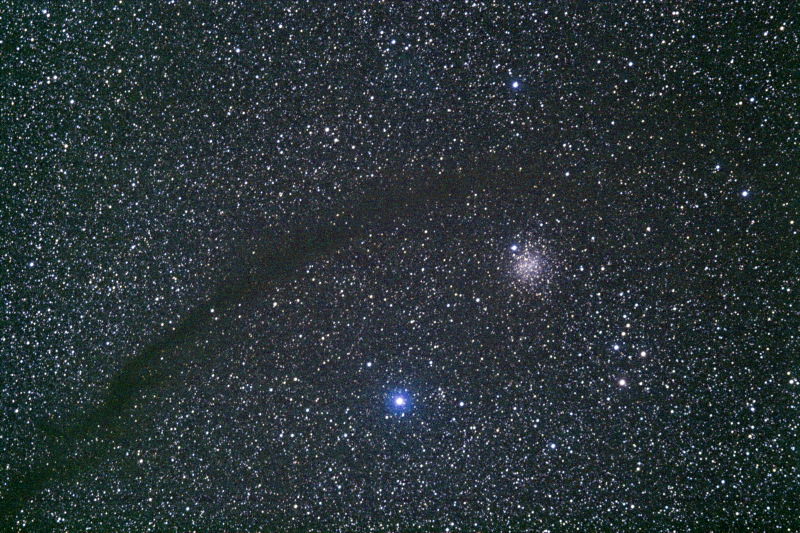 NGC6144 globular cluster on left, IC4603 centre, rho Oph in blue nebula on right