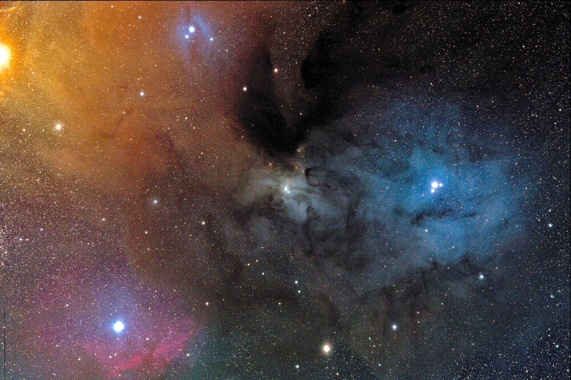 Rho Ophiuchi cloud complex. Orange Antares (on edge far left), sigma Scorpii in red nebula (bottom left)