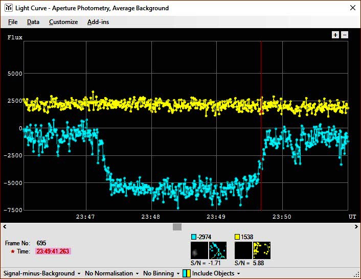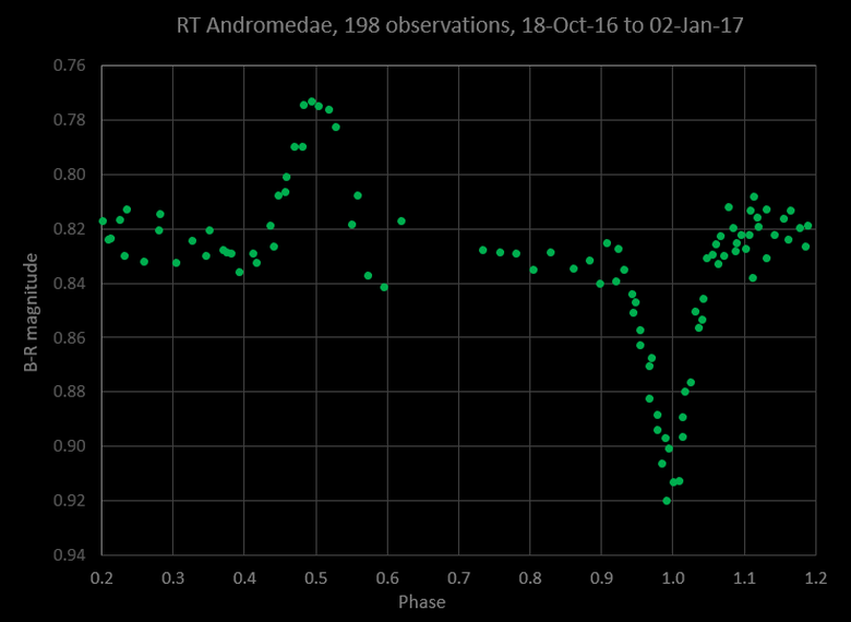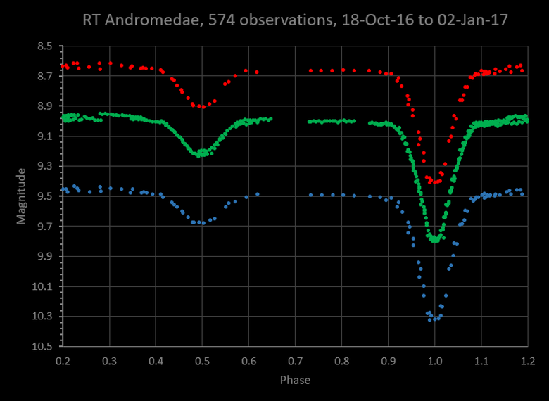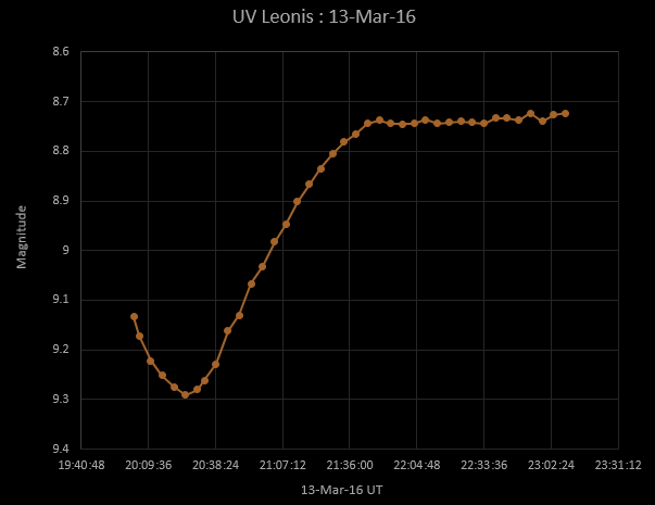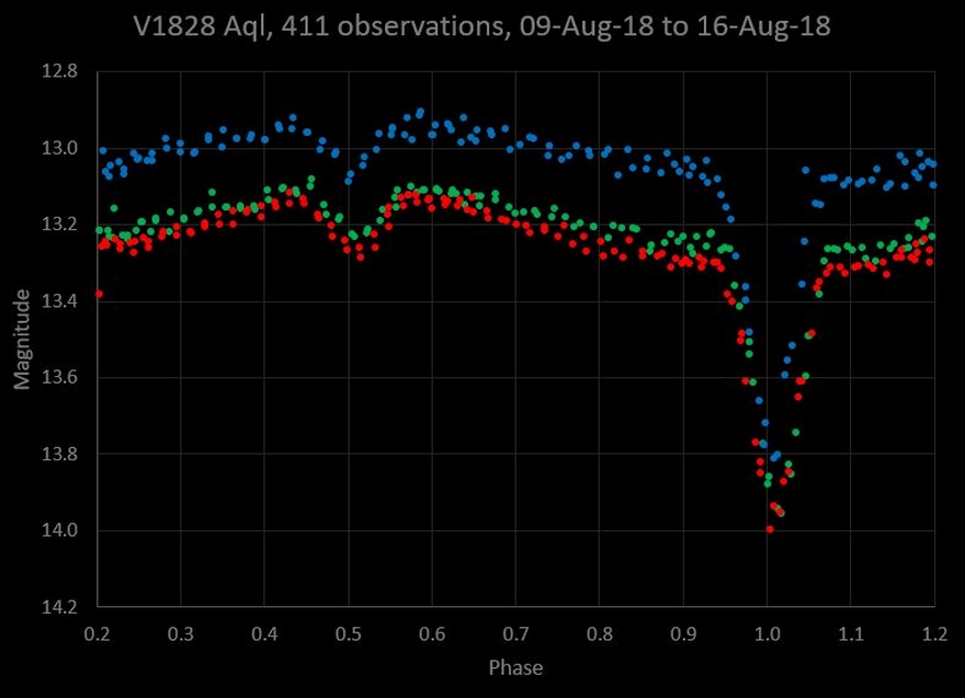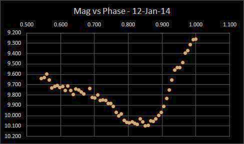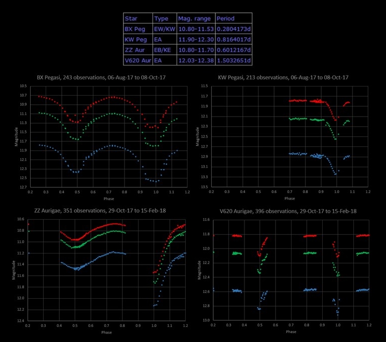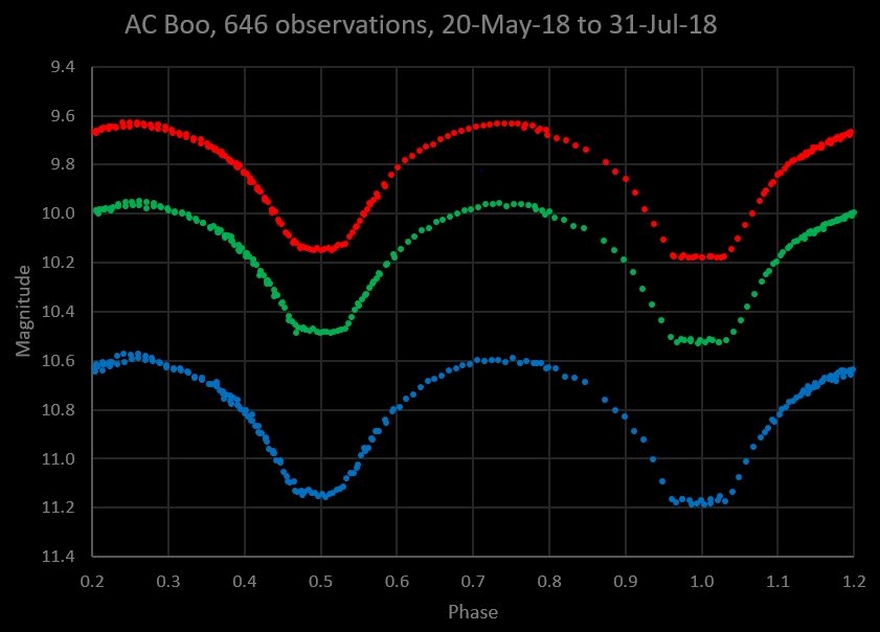 Analysis of stacked multiple images on every clear night available gives a light curve plot The quality of seeing gives variation in error estimates of the magnitude