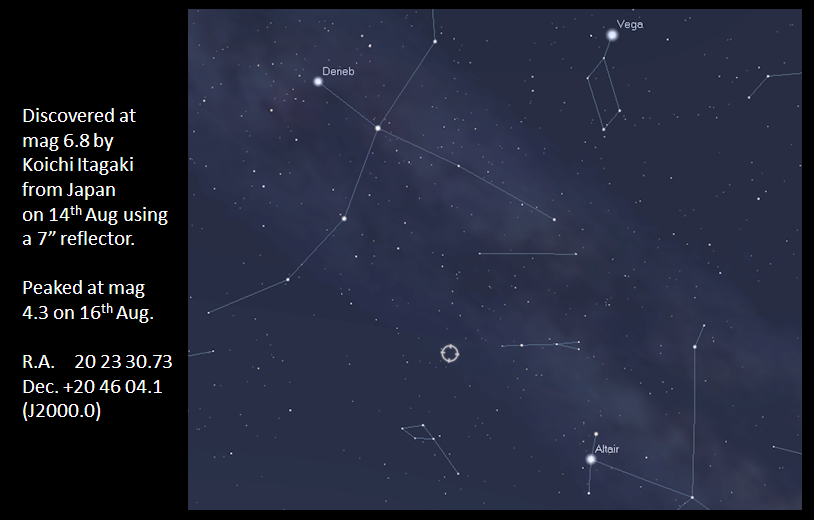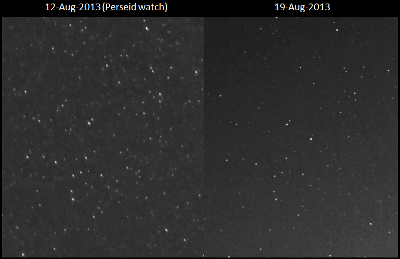 Left - Blow up of nova area of picture taken during Perseid meteor watch Right - First image of the same region showing the nova (brightest object)