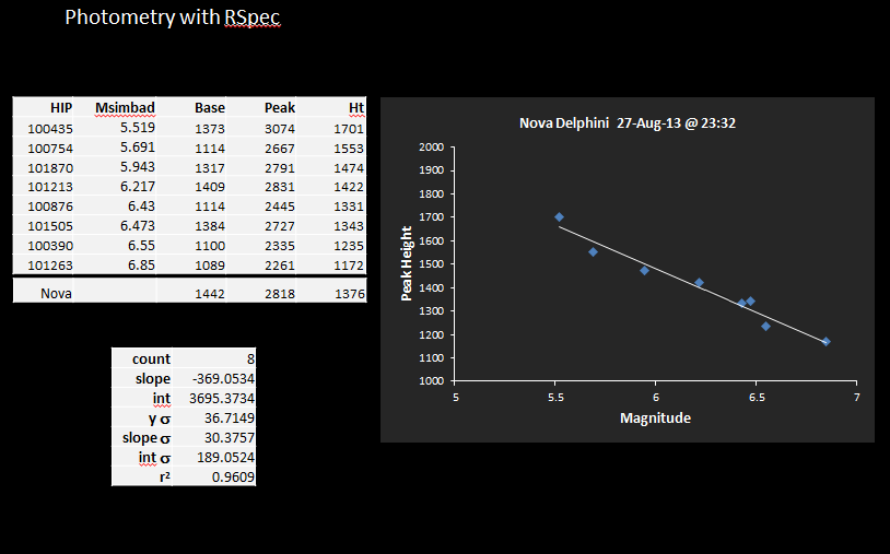 The same process is used to measure the peak heights of comparison stars of known magnitude A plot of peak height against magnitude gives the best fit straight line and error estimate The nova peak height can then be used to predict its magnitude