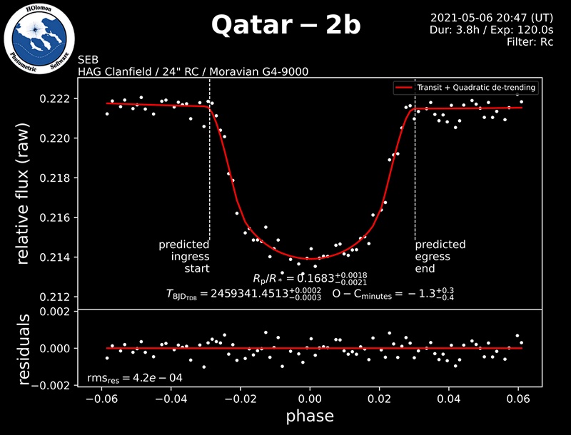 Plot of brightness of star Qatar 2 as planet (b) crosses its face Image obtained by Steve Futcher & Steve Broadbent (HAG members) with University of Portmouth Physics project students: A. Bugden, S. Crocker, N. Gorton, G. Lowe, E. Smith