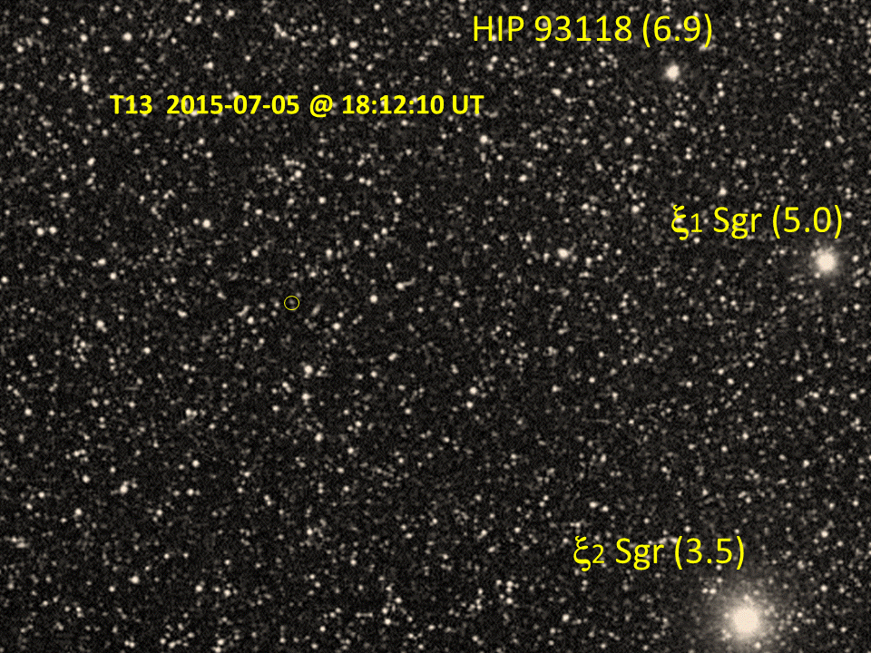 Comet C/2012 K5 Linear. 3 superimposed images 25 min apart, B/W negative to enhance contrast