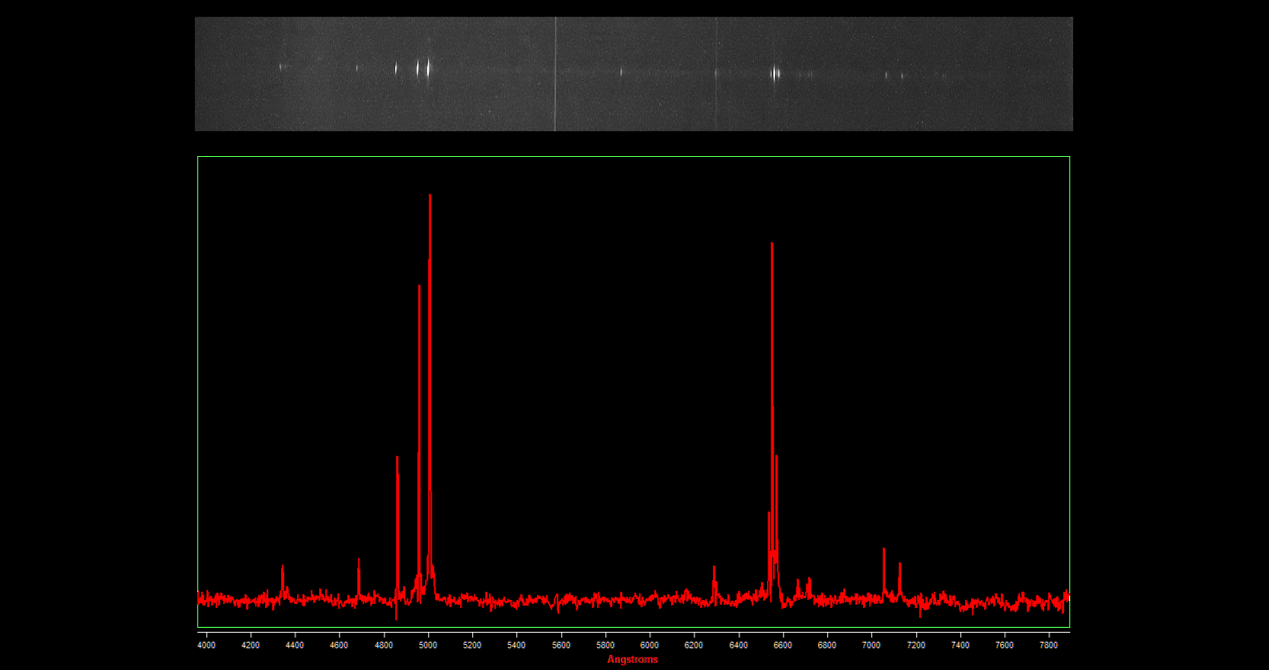 Faint red stellar object. Strong oxygen, some helium, sulphur and argon.