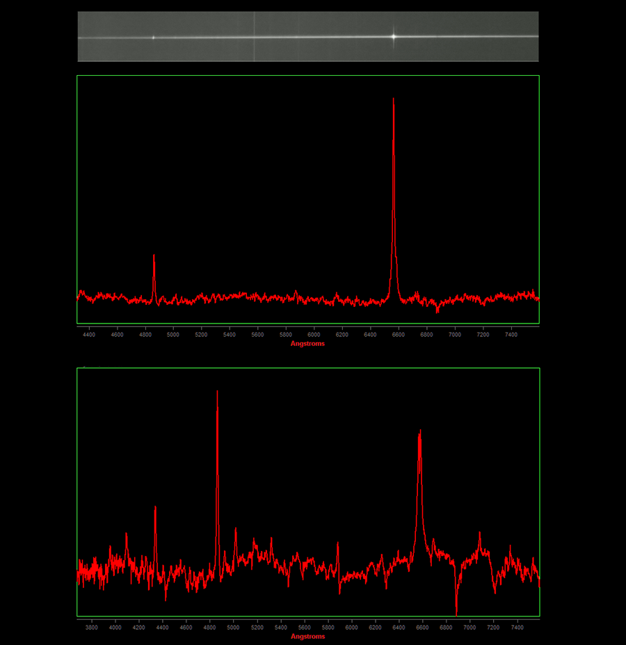 It shows 5 hydrogen Balmer emission lines and nitrogen and helium emission