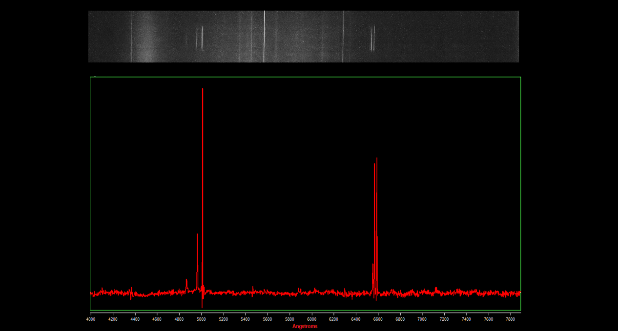Very faint bipolar arcs. Strong oxygen and nitrogen