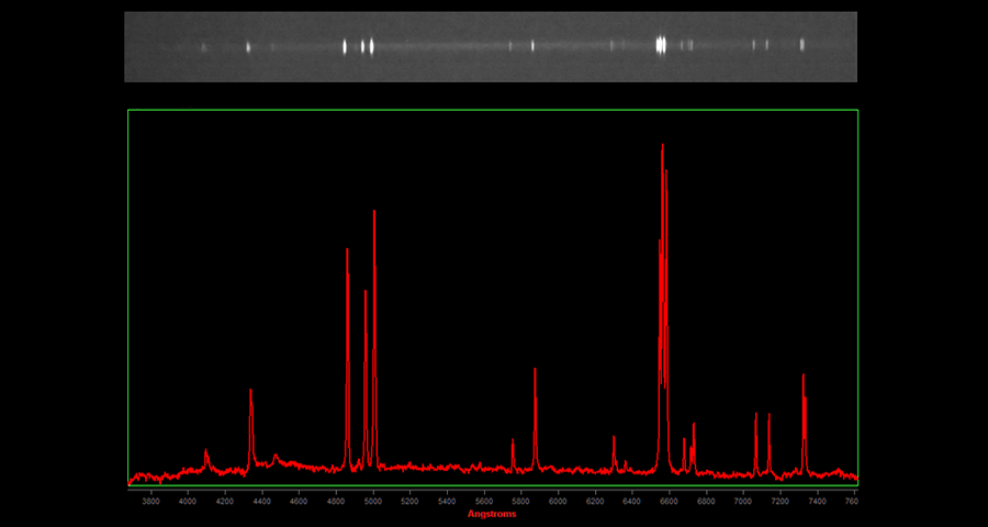 Shows helium sulphur and argon and rarer lines from nitrogen and oxygen