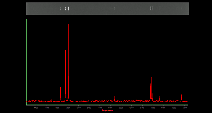 Small ring. Prominent nitrogen lines plus helium, sulphur and argon