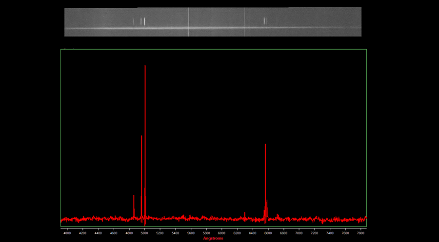 Faint small disk. Strong oxygen, some nitrogen, trace of sulphur