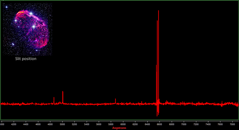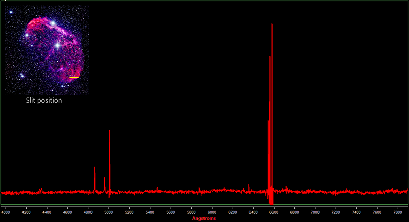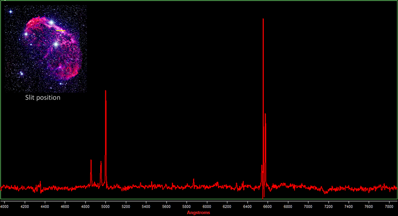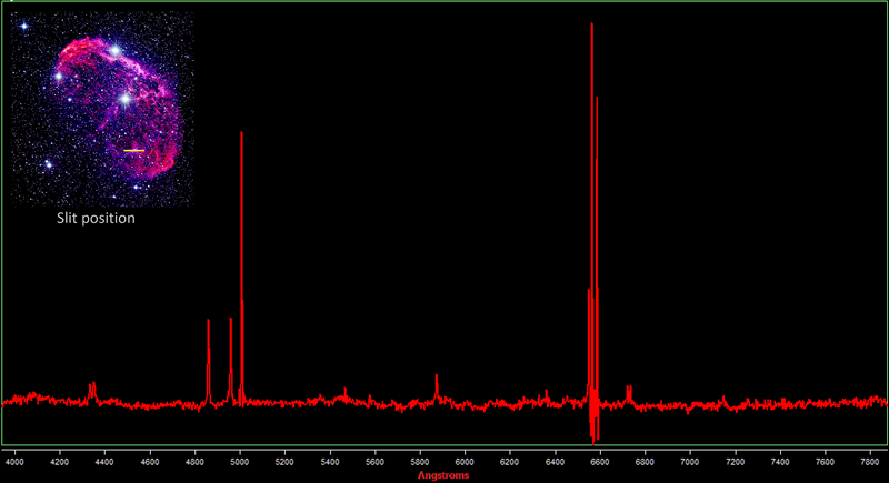 Spectra of various regions of NGC 6888Region 1 - Bright red reqion in north![]() Spectrum shows weak oxygen, strong nitrogen and traces of heliom and sulphur. Blue region weak, probably due to dust.