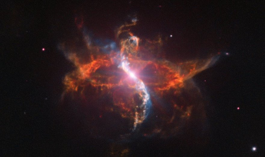 It is a binary system consisting of a white dwarf and a companion Mira-type red giant variable star, varying roughly from 5m to 13m with a slightly irregular period of about 390 days. The white dwarf siphons off material from the companion’s tenuous outer atmosphere onto its surface via an accretion disc. The buildup of material triggers outbursts from the white dwarf. The result is the system is enclosed in a nebula called Cederblad 211.