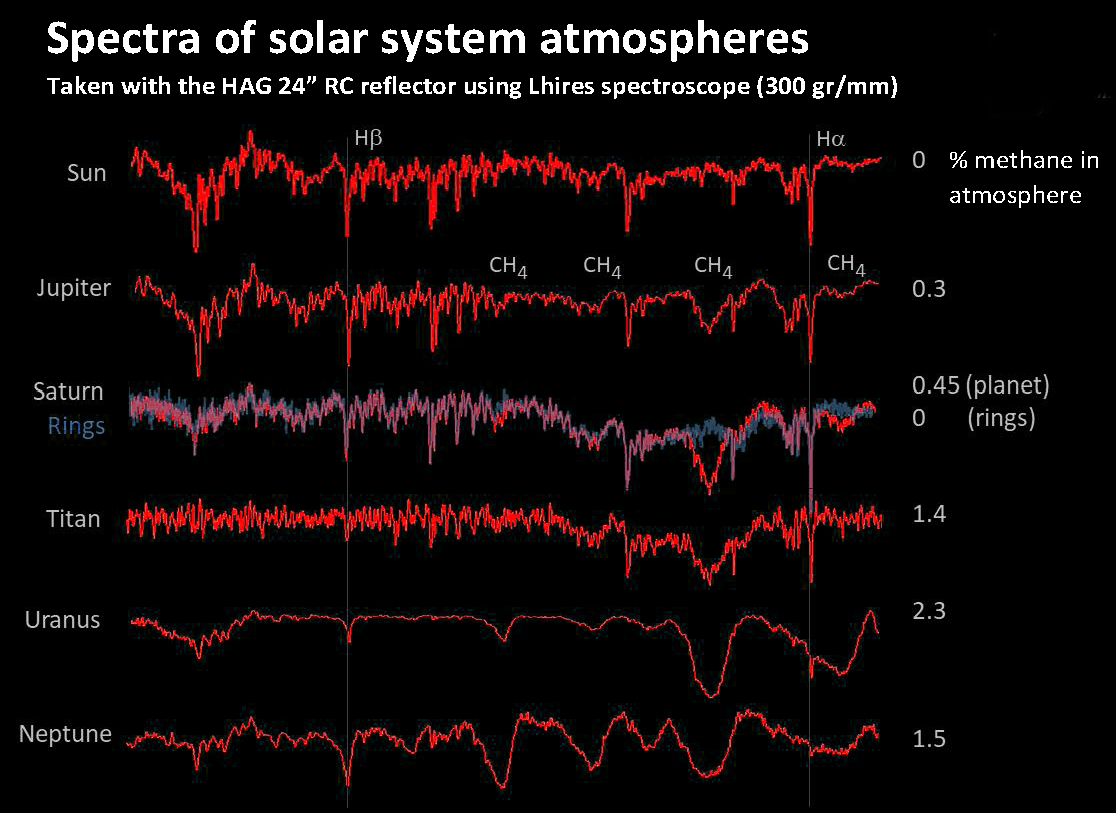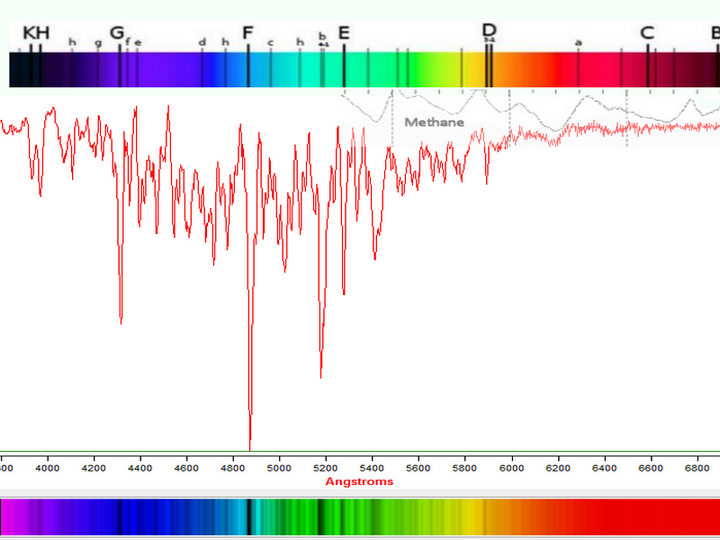 Analysis shows correspondence with known methane bands (Observed spectrum is RSpec colour version)
