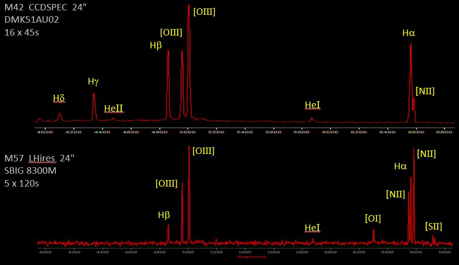 Comparison of spectra of M42 (Orion nebula) and M57 (Ring nebula)