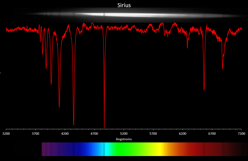 Top to bottom: Observed spectrum, RSpec graph, RSpec colour representation Hydrogen absorption spectrum with atmospheric lines at 6300 and 6900