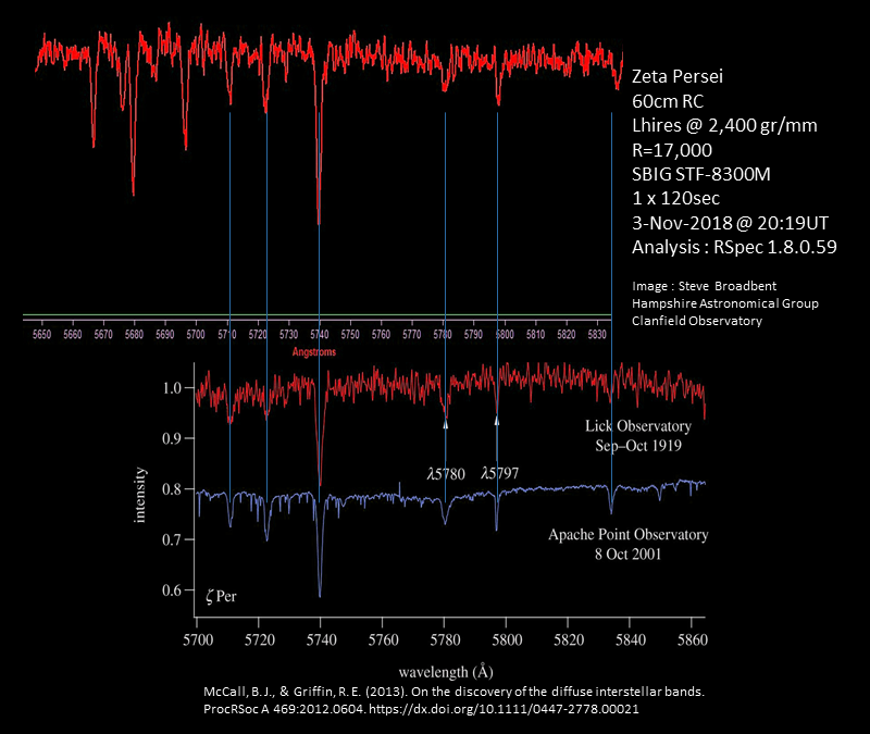 Diffuse Interstellar Bands in the spectrum of Zeta Persei. First detected in 1919 by Mary Heger.