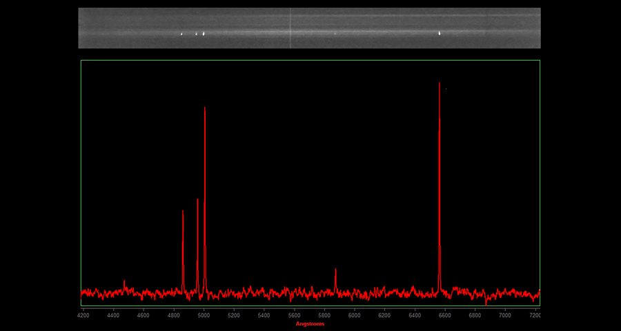 Very small and faint near centre of globular cluster M15. No nitrogen, some helium