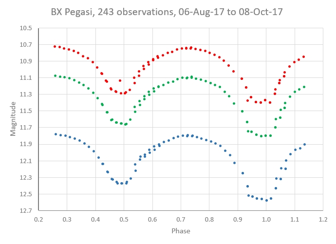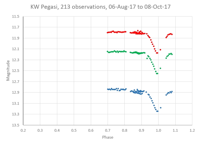 The project was successful and it is hoped to be extended using photometric filters to determine some of the star and system parameters. These observations are being repeated with photomentric filters to compare results. BX and KW Pegasi - Eclipsing binaries type EW/KW and EA respectively These stars were chosen as they are only 5 arcminutes apart so they could both be observed in the same image. The study of BX Peg is the subject of a University of Portsmouth final year maths project for 2017/18.