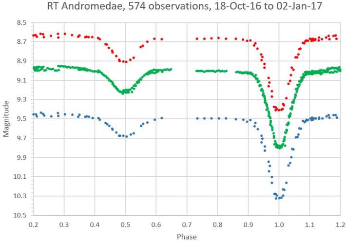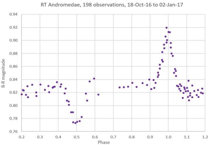 RT Andromedae – Eclipsing binary, type EA/RS This star was chosen as the subject for a University of Portsmouth final year maths project in 2016/17. It was chosen as it has convenient period, magnitude range and is observable from August until February.