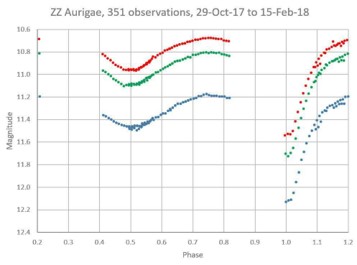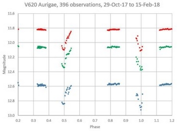 ZZ and V620 Aurigae - Eclipsing binaries type EB and EA respectively These stars are only 2.5 arcminutes apart so they could both be observed in the same image.